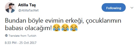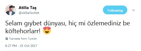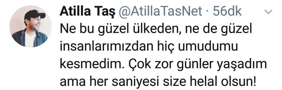 Feto'cu olduğu iddiasıyla cezaevine konulan Atilla Taş tahliye olmasının ardından ilk tweetini attı.